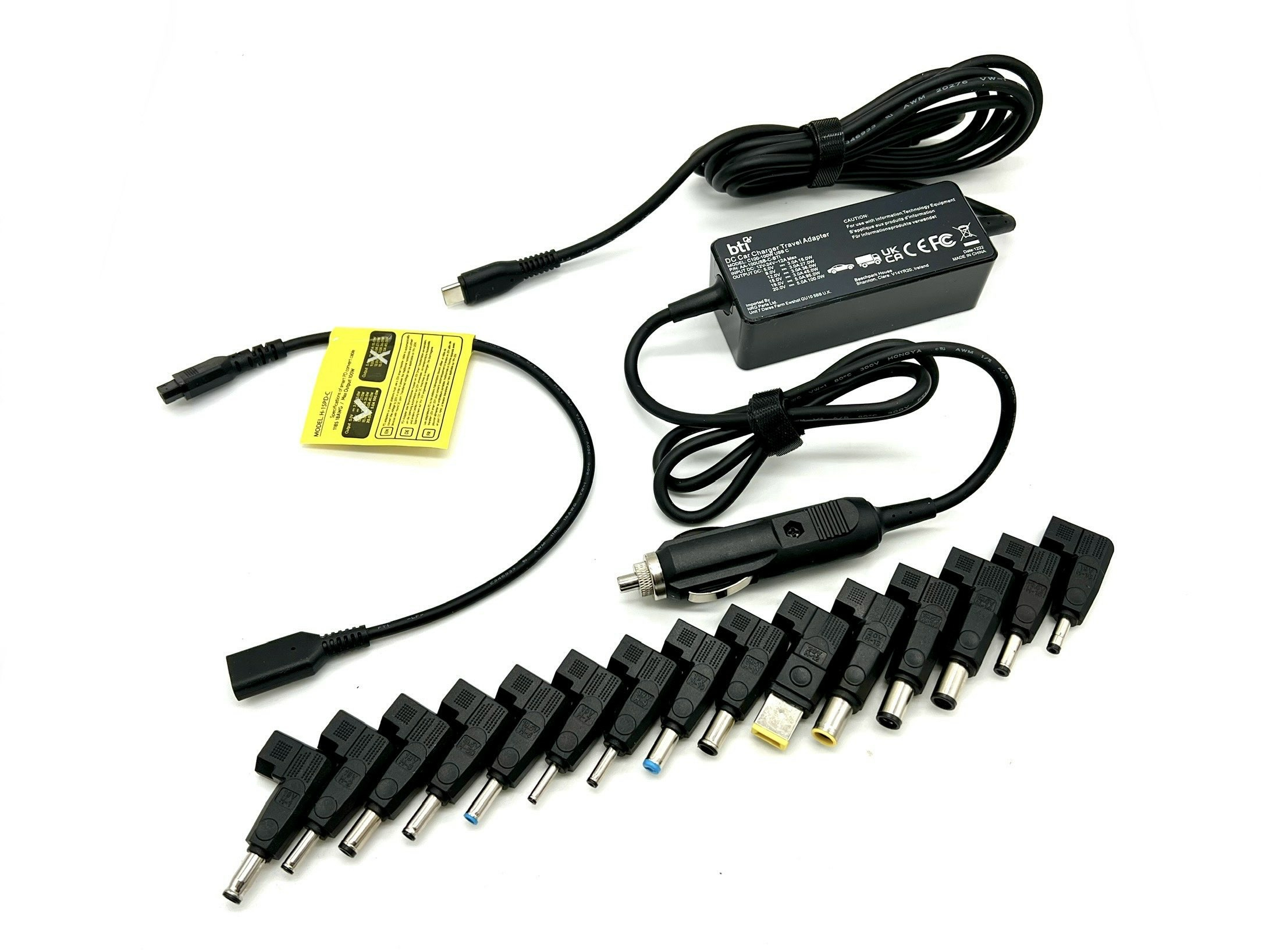 BTI 100W universal Car charger for HP Dell Lenovo Asus Acer Sony Toshiba Fujitsu Samsung etc. Includes USB-C connector as well as 15 additional options to power a wide range of the most popular laptops