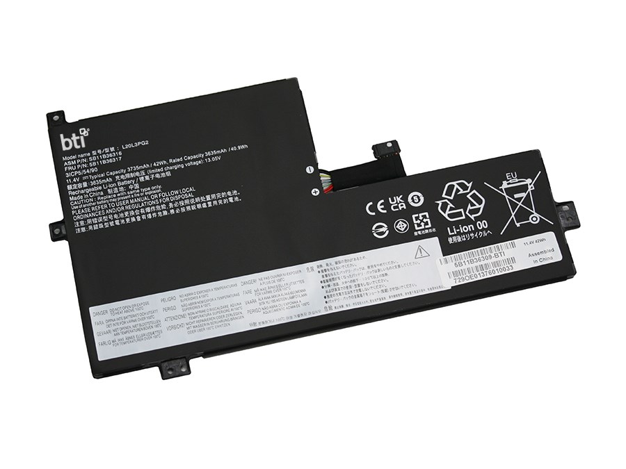 BTI L20M3PG2 compatible 42Wh 3-cell battery for LENOVO CHROMEBOOK 500E G3 100E G2. Number of batteries included: 1 pc(s). Battery capacity: 3680 mAh, Battery capacity: 42 Wh, Battery technology: Lithium-Ion (Li-Ion), Battery voltage: 11.4 V, Product colour: Black