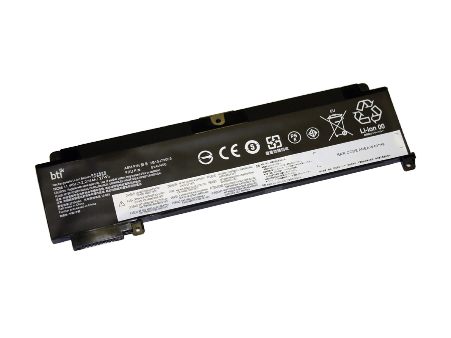 BTI SB10J79003 compatible 27Wh 3-cell battery for Lenovo Thinkpad T460s T470s FRONT BATTERY. Number of batteries included: 1 pc(s). Battery capacity: 2270 mAh, Battery capacity: 26 Wh, Battery technology: Lithium-Ion (Li-Ion), Battery voltage: 11.46 V, Product colour: Black